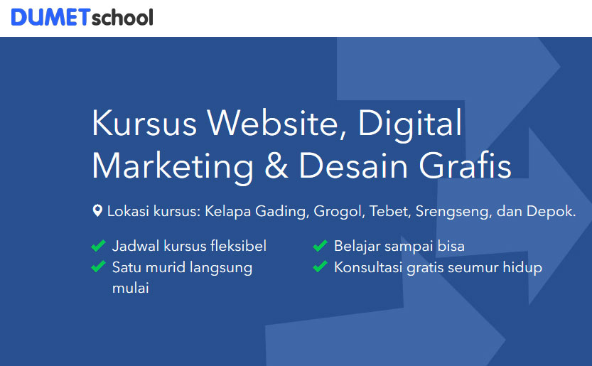 Dumet School saat ini sudah memiliki banyak murid yang berasal dari sekolah, universitas, instansi pemerintah dan perusahaan ternama. Dumet School pun memberikan berbagai penawaran menarik untuk para murid yang akan dan sudah mendaftar. Jika penasaran kamu bisa langsung mencari tau informasi mengenai berbagai penawaran dari dumet school langsung lewat websitenya dumet school melalui link (www.dumetschool.com), sekian dan terima kasih, semoga bermanfaat.